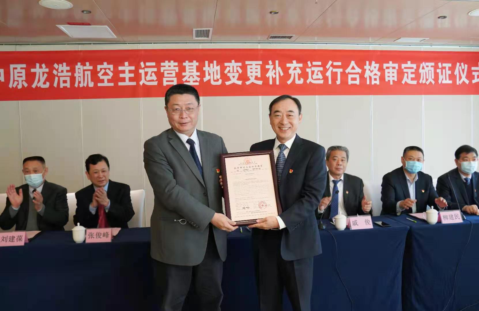 3月4日上午,民航中南地區(qū)管理局局長馬兵在鄭州向中原龍浩航空有限公司頒發(fā)了《航空承運人運行合格證》,這標(biāo)志著中原龍浩的主運營基地由廣州變更至鄭州新鄭國際機場,進(jìn)入了鄭州廣州“雙基地”協(xié)同聯(lián)動、充分運營的新階段。河南省財政廳黨組成員、副廳長趙慶業(yè)與馬兵共同參加頒證儀式并致辭,民航河南監(jiān)督管理局局長戚俊主持儀式。頒證結(jié)束后,馬兵等參觀了中原龍浩AOC運行控制大廳。