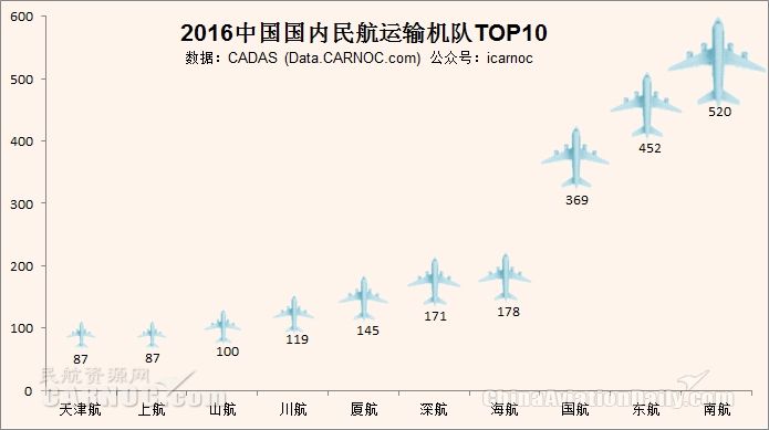 機(jī)隊(duì)規(guī)模百架以上的航空公司共計(jì)8家,其中中國(guó)南方航空股份有限公司機(jī)隊(duì)擁有飛機(jī)520架;中國(guó)東方航空股份有限公司擁有452架飛機(jī),中國(guó)國(guó)際航空股份有限公司369架。海南航空股份有限公司178架。