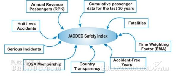JACDEC安全指標的評比參數(shù)包括在過去30年間航班墜毀的數(shù)量、傷亡人數(shù)、安全年份年數(shù)以及航司所在國家政府的透明度等參數(shù)。