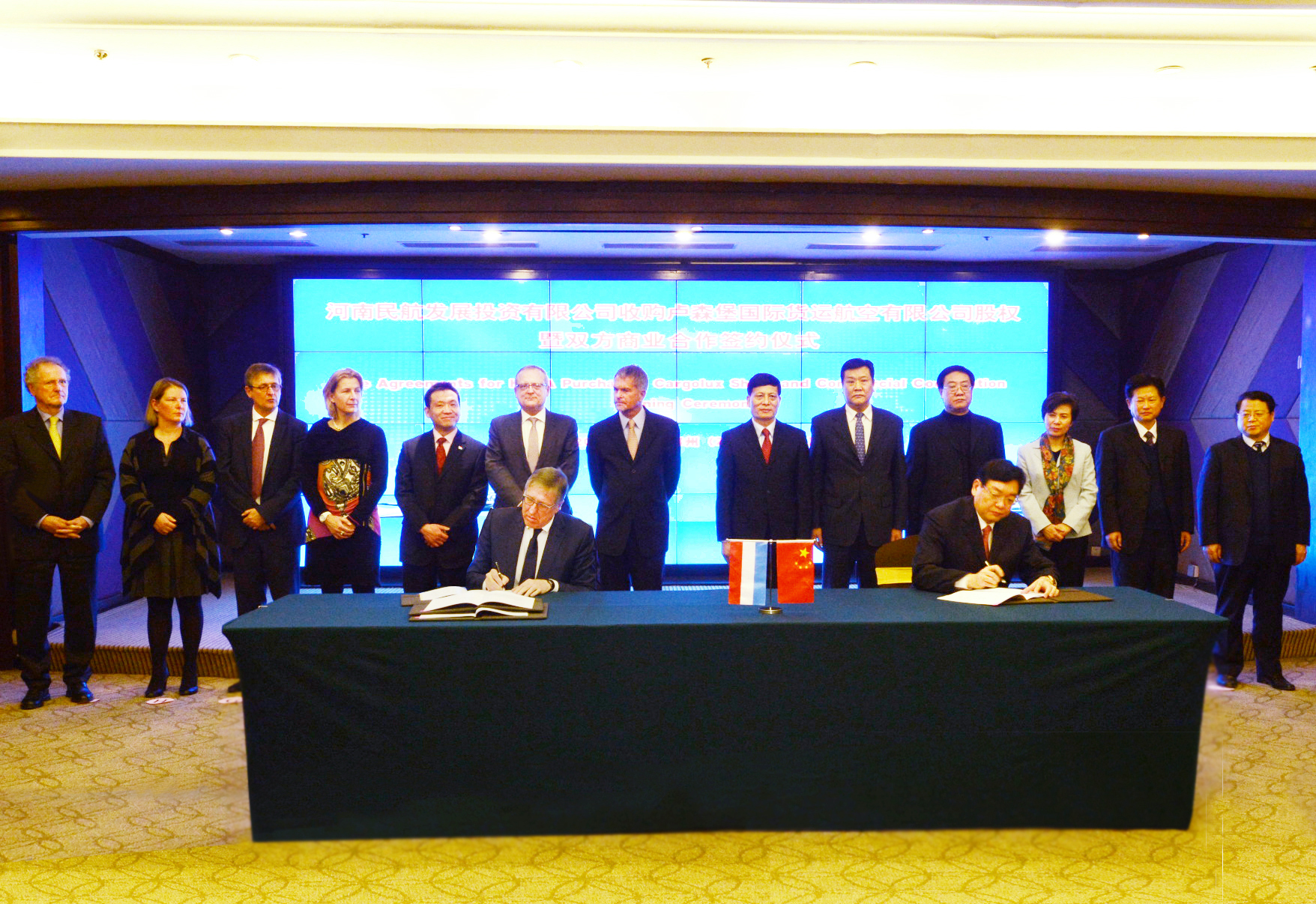1月14日下午,河南航空業又迎來一樁盛事:河南民航發展投資有限公司(以下簡稱河南航投)收購盧森堡國際貨運航空公司(以下簡稱盧貨航)股權暨雙方商業合作簽約儀式在鄭州舉行,河南航投董事長、黨委書記張明超分別與盧森堡可持續發展與基礎產業部部長弗朗索瓦?鮑施、盧貨航董事會主席保羅?海明格簽署了相關協議。這標志著國際一流的全貨運航空公司正式落戶鄭州航空港經濟綜合實驗區,該合作架起了一條橫貫中歐的貨運“空中絲綢之路”,為河南省對外開放增添了新高地。河南省省長謝伏瞻在簽約前會見盧森堡代表團并見簽。盧森堡駐上海總領事呂可為、河南省副省長趙建才,省長助理、省民航辦主任安惠元,河南航投總經理、副董事長、黨委副書記劉建葆一同參加了儀式。